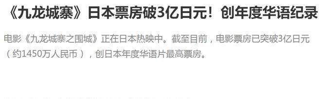 昨年五一档,古天乐主演的《九龙城寨》在内地狂揽6.84亿票房,成了港片回话的象征性作品。这片子当今还在日本热映,票房也曾冲到3亿日元,约1450万东谈主民币,创下了日本年度华语片的最高记录。