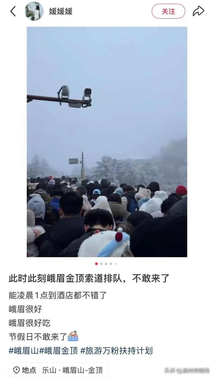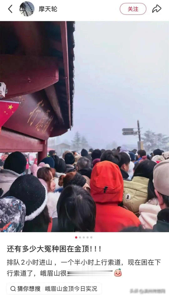 1月2号那天,峨眉山免费怒放的第二天,东谈主就多到弗成,本来思让大伙儿任意逛寺庙、望望边幅,遵守没提前安排好车票、索谈和步谈这些事,早上九点进山的搭客,晚上八点半才下山,真确切金顶待的技术不到半小时,大部分技术皆在列队。