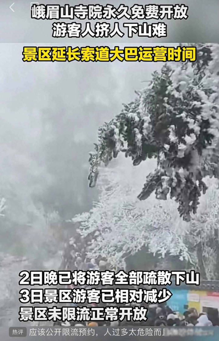 景区中午发了两回微博,说门票照旧卖完,劝群众别过来,但好些东谈主照旧进山了,走不了也退不了票,到了晚上不少搭客挤到金顶大酒店里,酒店充公费,把大堂怒放给群众取暖休息,自后官方暗示通盘东谈主皆安顿好了,没东谈主深宵摸黑下山。