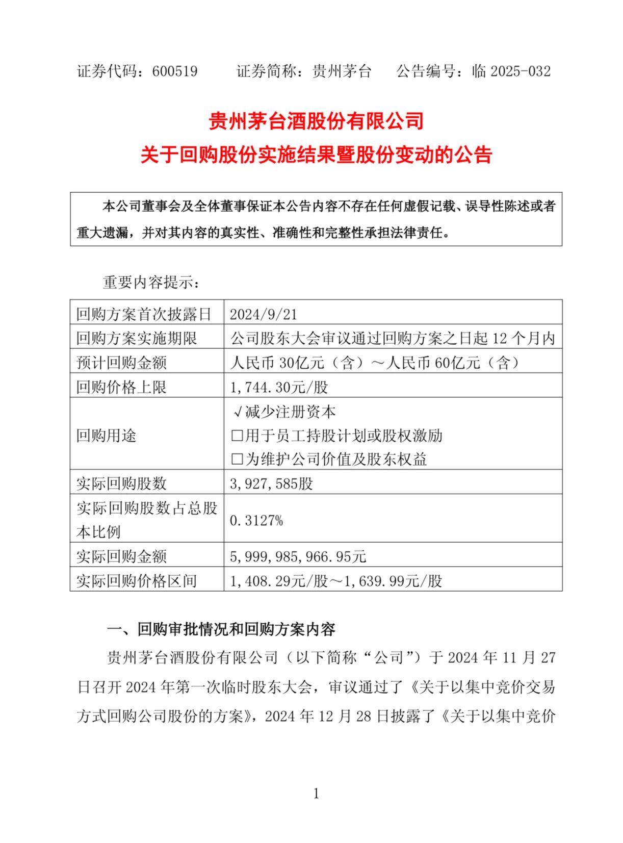 8月29日,贵州茅台酒股份有限公司(股票代码:600519.SH)公告称,自2025年1月2日初度回购以来,公司8个月已完成回购股份,骨子回购股数为392.76万股,占总股本的0.3127%,回购价钱区间为1408.29元/股—1639.99元/股,使用资金总数60亿元。