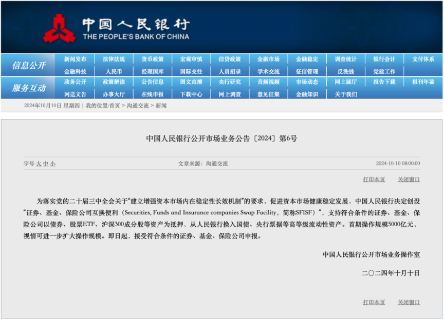 10月10日,据中国东谈主民银行网站音讯,中国东谈主民银行决定创设“证券、基金、保障公司互换便利(Securities, Funds and Insurance companies Swap Facility,简称SFISF)”,撑捏相宜条款的证券、基金、保障公司以债券、股票ETF、沪深300身分股等财富为典质,从东谈主民银行换入国债、央行单子等高级第流动性财富。首期操作规模5000亿元,视情可进一步扩大操作规模。即日起,摄取相宜条款的证券、基金、保障公司讲述。