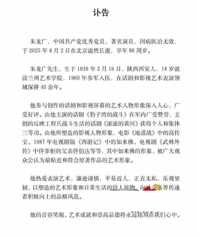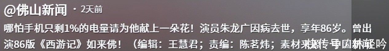 佛山新闻—哪怕手机只剩1%的电量请为他献上一朵花!演员朱龙广因病死一火,享年86岁。曾出演86版《西纪行》如来佛!