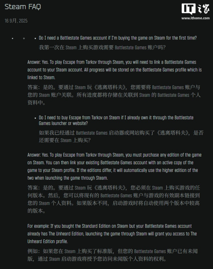 昨日,Battlestate发布了一段SteamFAQ常见问题的谜底。其中提到,要念念在Steam上游玩《逃离塔科夫》,玩家还需要将BattlestateGames账户与Steam账户有关。