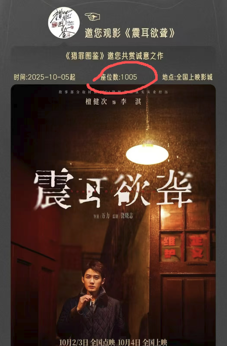 比如《震耳欲聋》上映,电视剧《猎罪图鉴》包场1005张票支捏电影。两部作品的出品公司毫无斟酌,更像是主演檀健次打着电视剧的步地给电影包场。扫码领到的是30元的抵扣券,意味着一次包场就进入了30000元。不外这个国庆档檀健次除了《震耳欲聋》,其实还配音了《三国的星空第一部》,但他并莫得为这部动画电影包场。