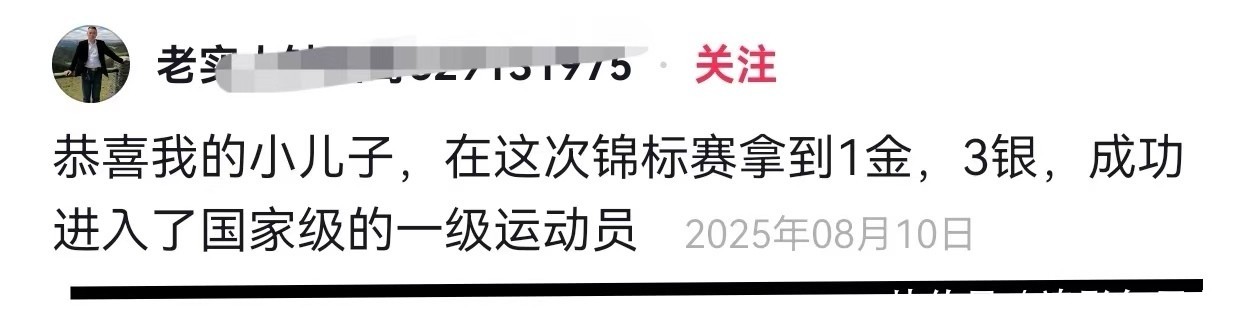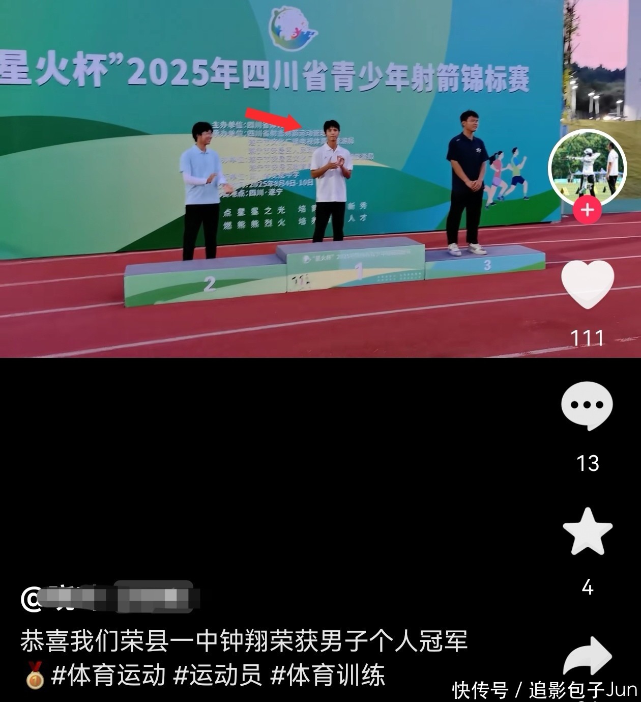 最关键的是,钟翔是别称优秀的射箭小将,除了发奋也极具射箭天禀,在2025年8月份的四川省青少年射箭锦标赛中夺得了一金三银,并拿到了个东说念主冠军,并凭借该得益成效干涉国度一级通顺员行列。