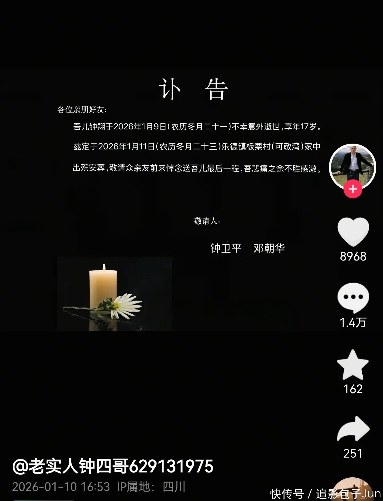 据钟翔父亲钟卫平发布的讣告,钟翔于1月9日不幸遭受不测物化,年仅17岁,已于1月11日出丧埋葬,但讣告并未露馅具体原因。