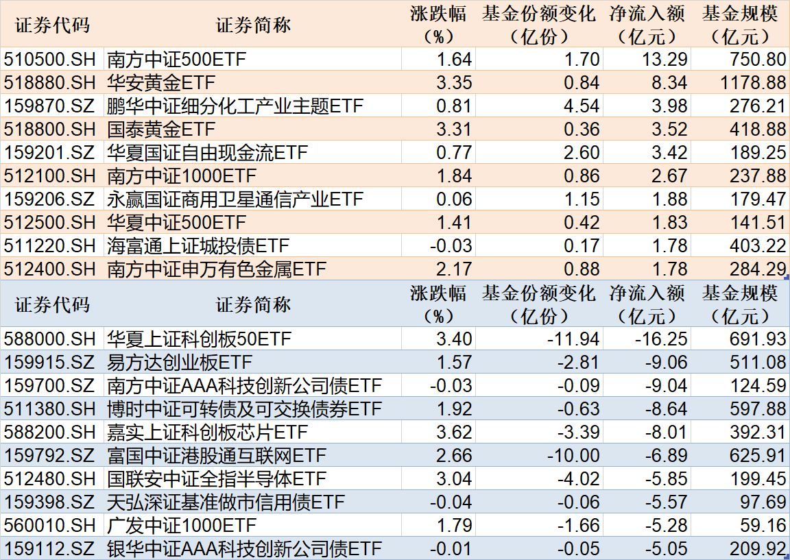 与此同期,中原上证科创板50ETF基金份额减少11.94亿份,净流出额16.25亿元;易方达创业板ETF基金份额减少2.81亿份,净流出额9.06亿元;南边中证AAA科技革命公司债ETF基金份额减少0.09亿份,净流出额9.04亿元。