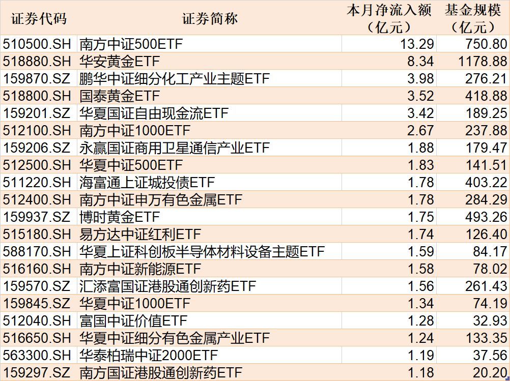适度4月1日,本月资金净流入额居前20的ETF名单如下: