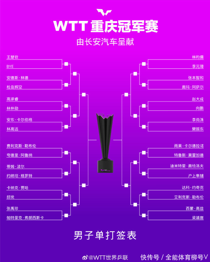 再加上00后小将向鹏,中国男乒共有6位选手参预本次比赛,他们有望再次得回冠军。从签位看,王楚钦、林高远被分在上半区,寰球第一王楚钦在首轮轮空,林高远迎战瑞典的卡尔伯格。