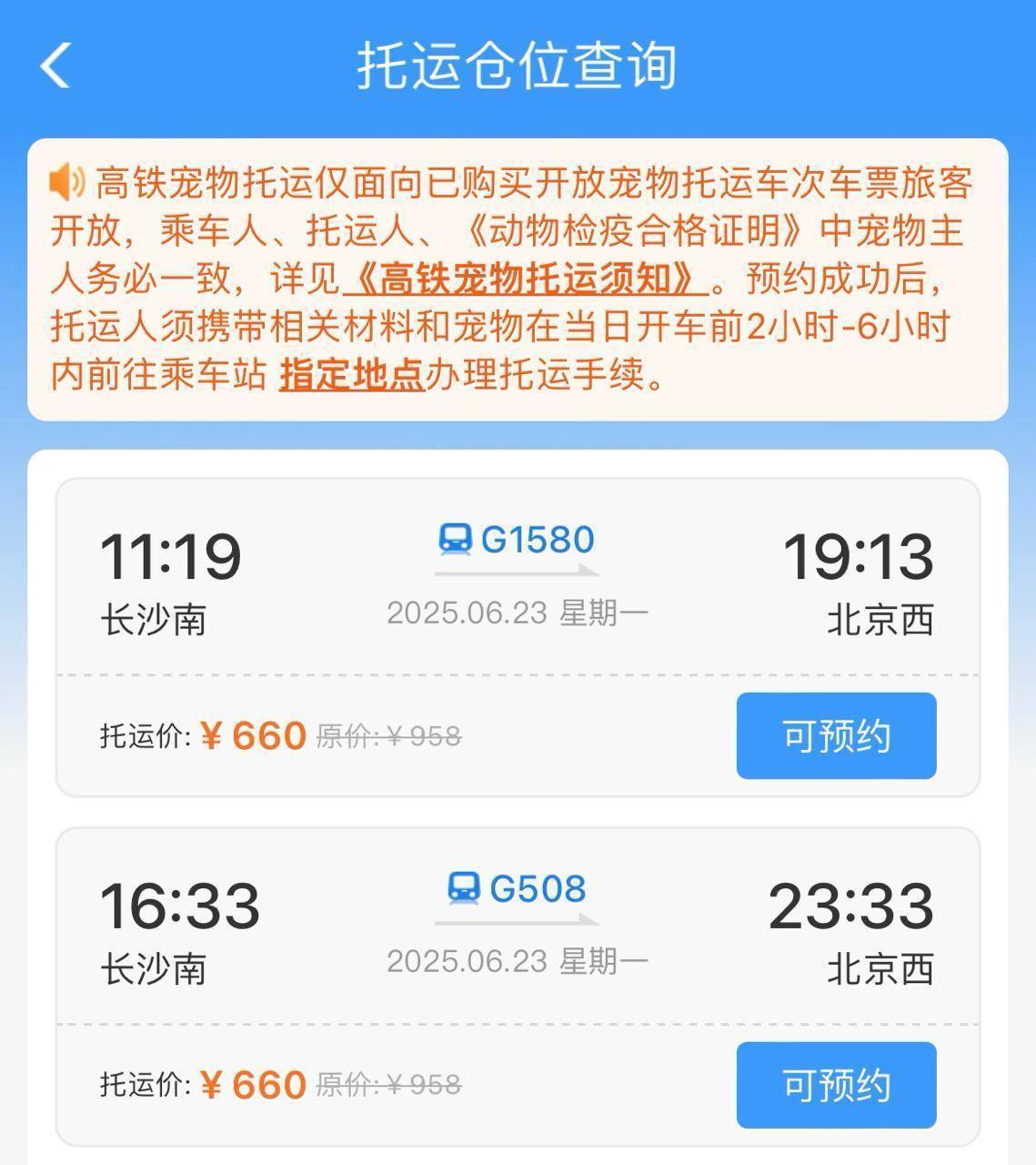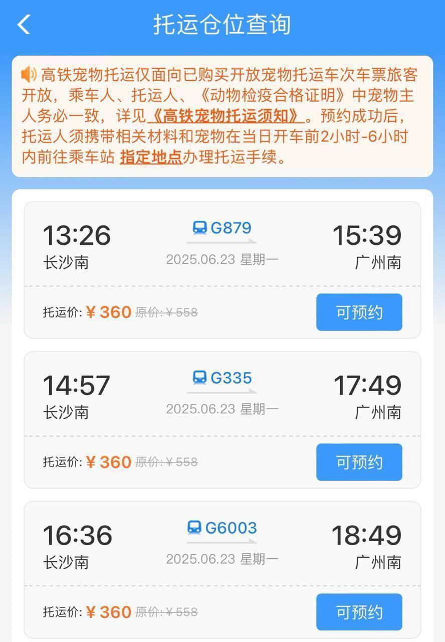 从长沙南起程,到底哪些列车上不错托运宠物呢?记者对照新增的车站,选拔性的进行了查询。当今从长沙南起程,起程日历设定为6月23日,往北京西站,共有2两趟列车不错办理宠物托运业务,折柳为G1580和G508次列车,自满的托运价钱为660元。去往近一些的武汉站,当今则有3趟列车不错办理宠物托运业务,折柳为G1580、G508、G884次列车,托运价钱自满为360元。从长沙南往广州南站,当今亦然3趟列车不错办理该业务,为G879、G335、G6003次列车,价钱也为360元。